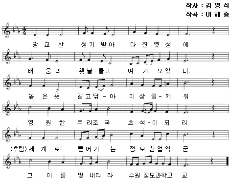 큰 타원은 화합과 결합을 의미하며, 가운데 삼각형은 지식과 기능을 바탕으로 세계를 향해 발전해 나가는 진취적인 기상을 상징한다. 파란색 바탕은 본교 명칭의 머리글자인 “수”를, 가운데 자리한 “I”는 INFORMATION(정보)의 첫 글자와 공업의 머리글자인 “工”을 함께 나타내었다.